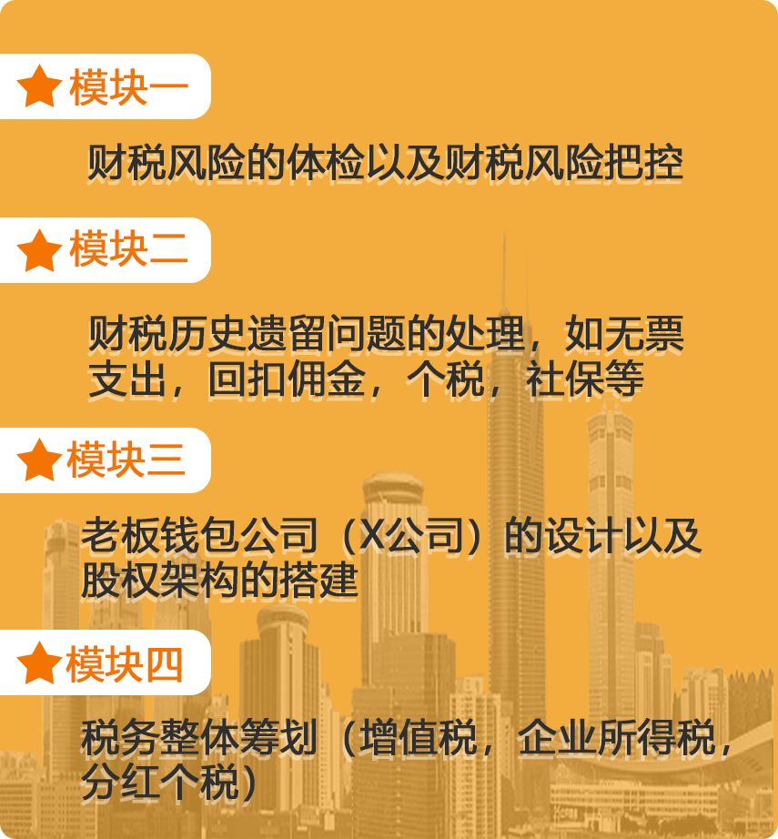 橙子财税集团是一家致力于为民营企业和代记账公司,提供老板财税培训、财税咨询、财税咨询师培养的财税整体解决方案公司。